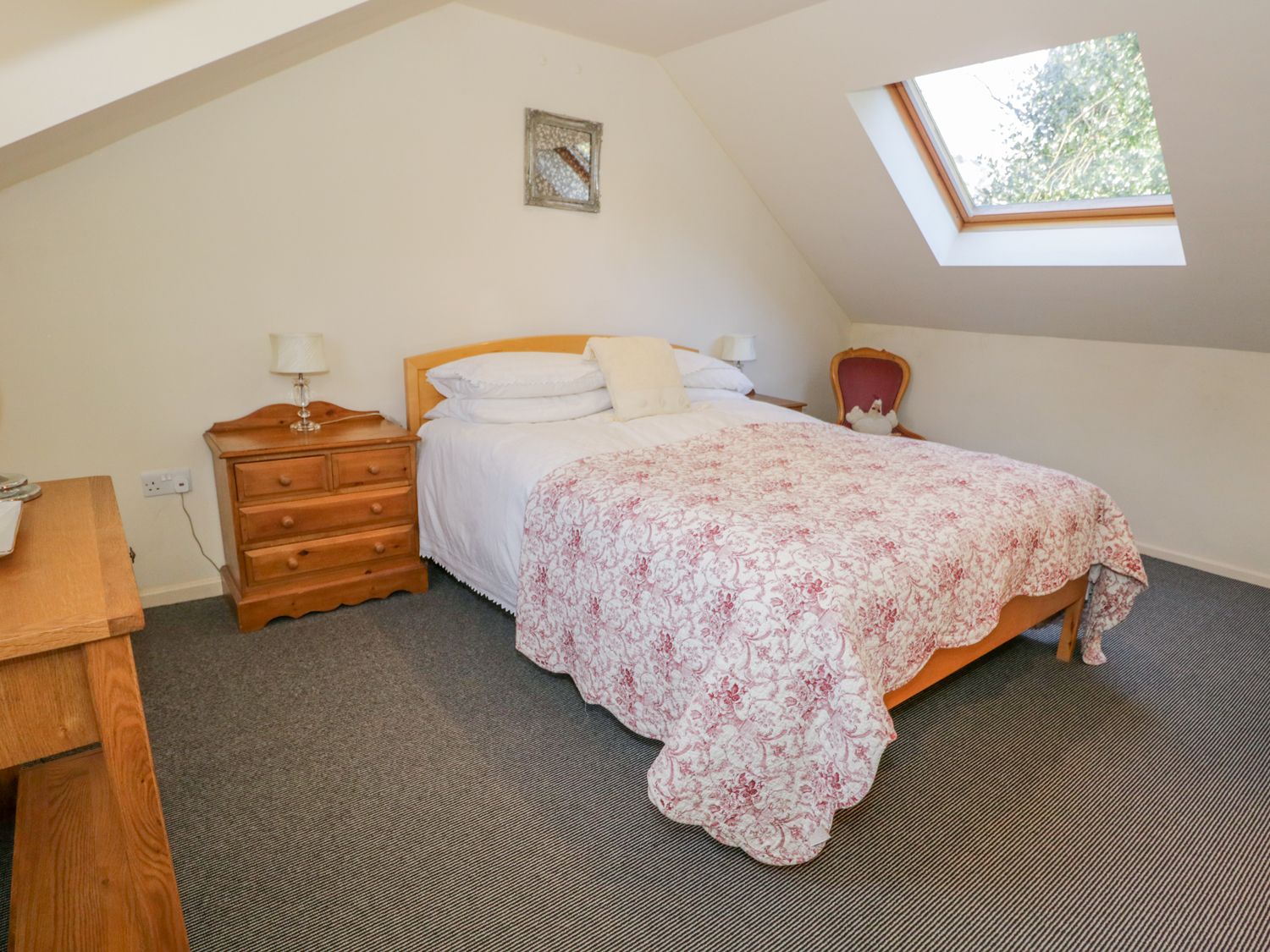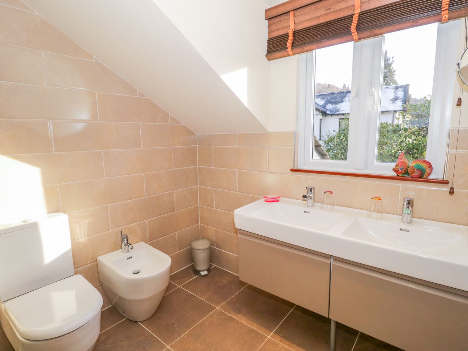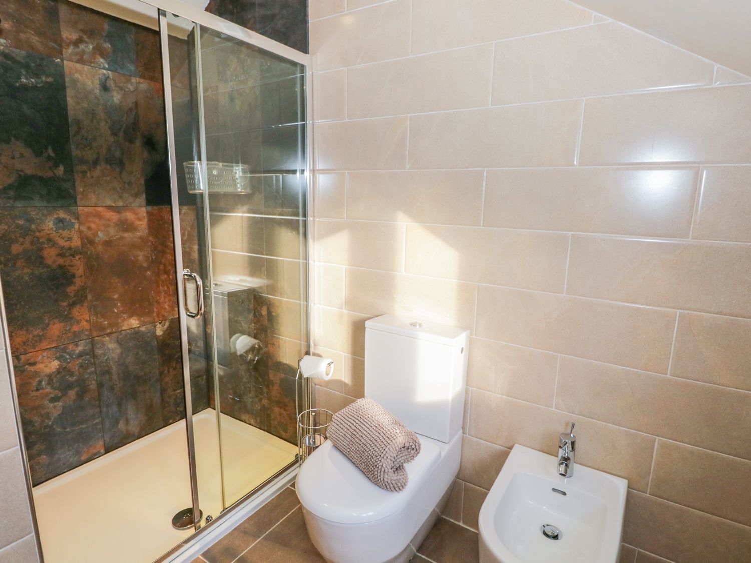 The first floor consists of a cosy Master bedroom with king size bed and fully tiled bathroom, large walk in shower, bidet and his and her wash hand basins. WC and chrome heated towel rail.