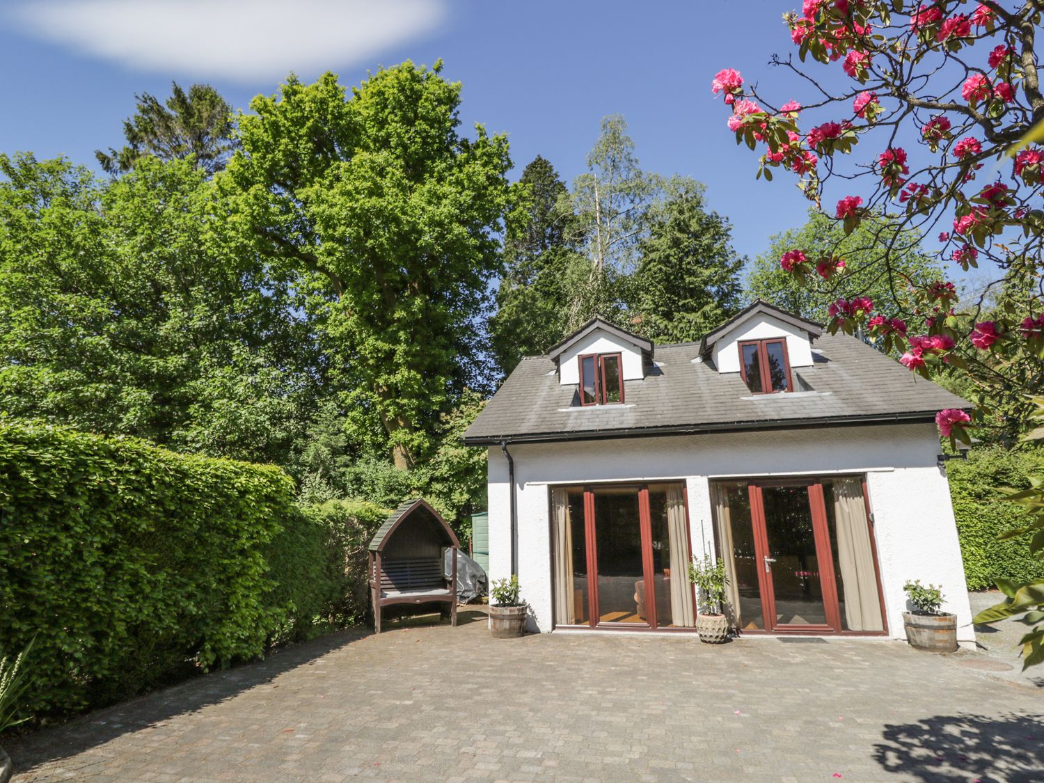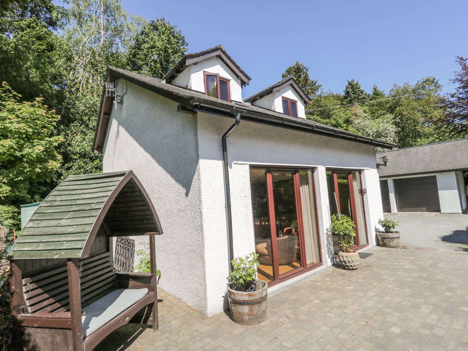 Private parking and outdoor seating area.