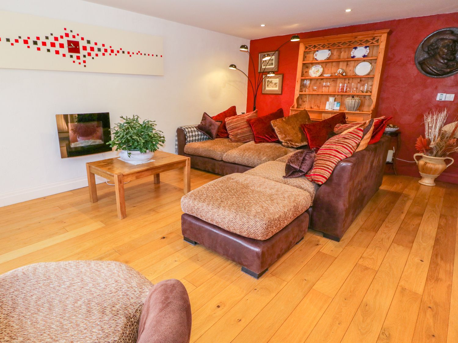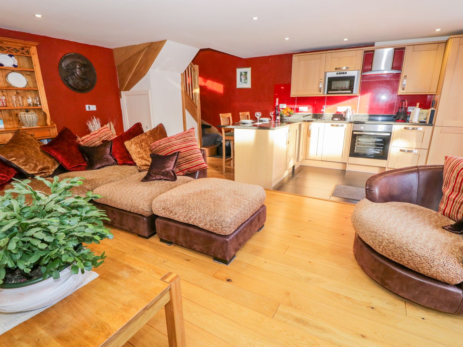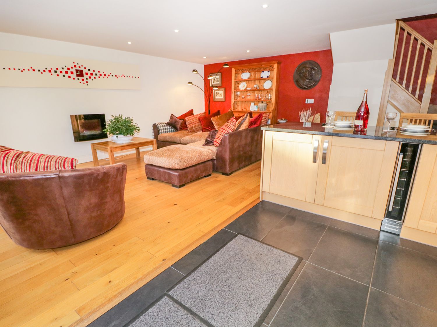 Spacious and stylish open living area with solid wooden floor, underfloor heating and spot lighting.