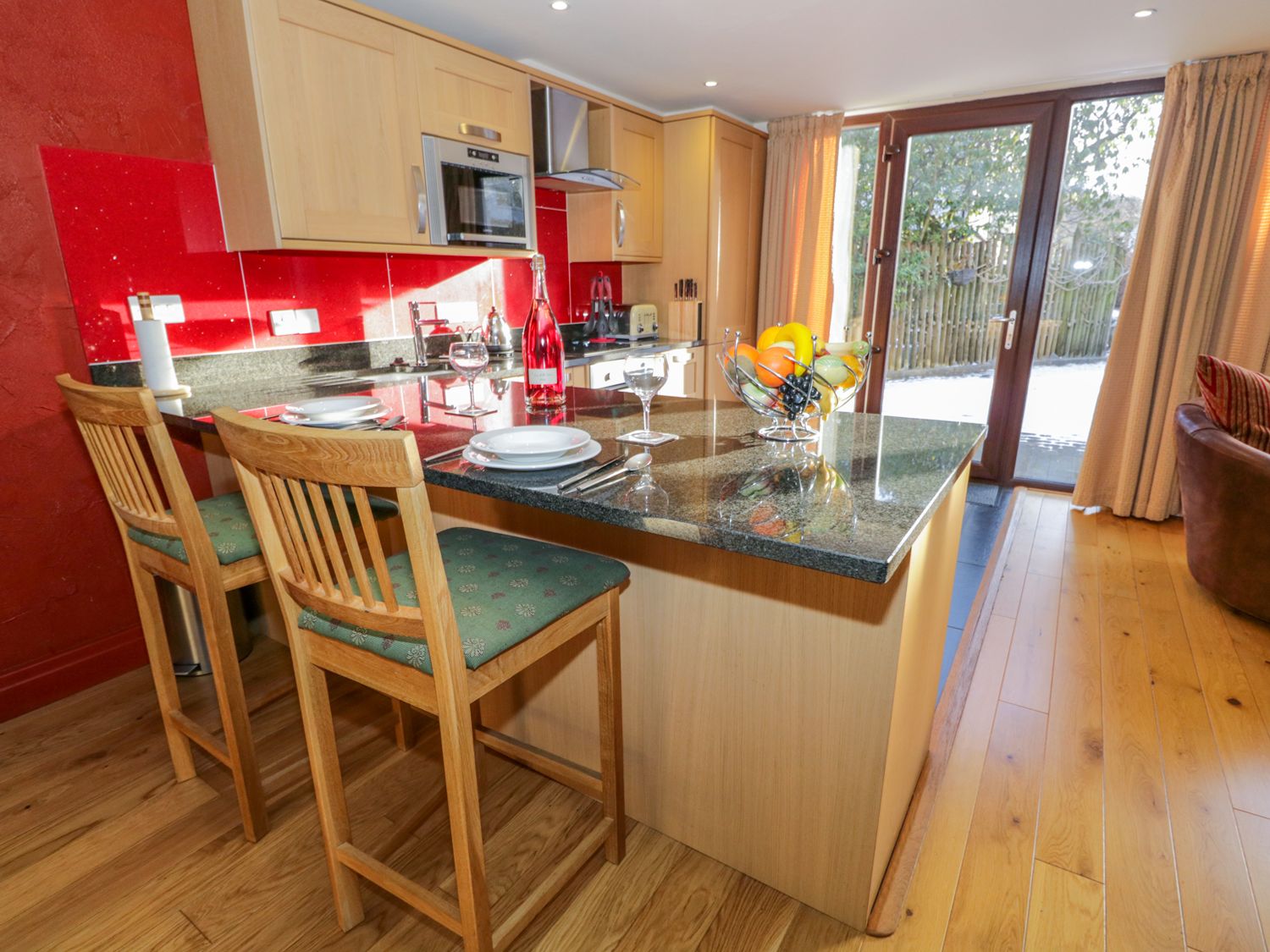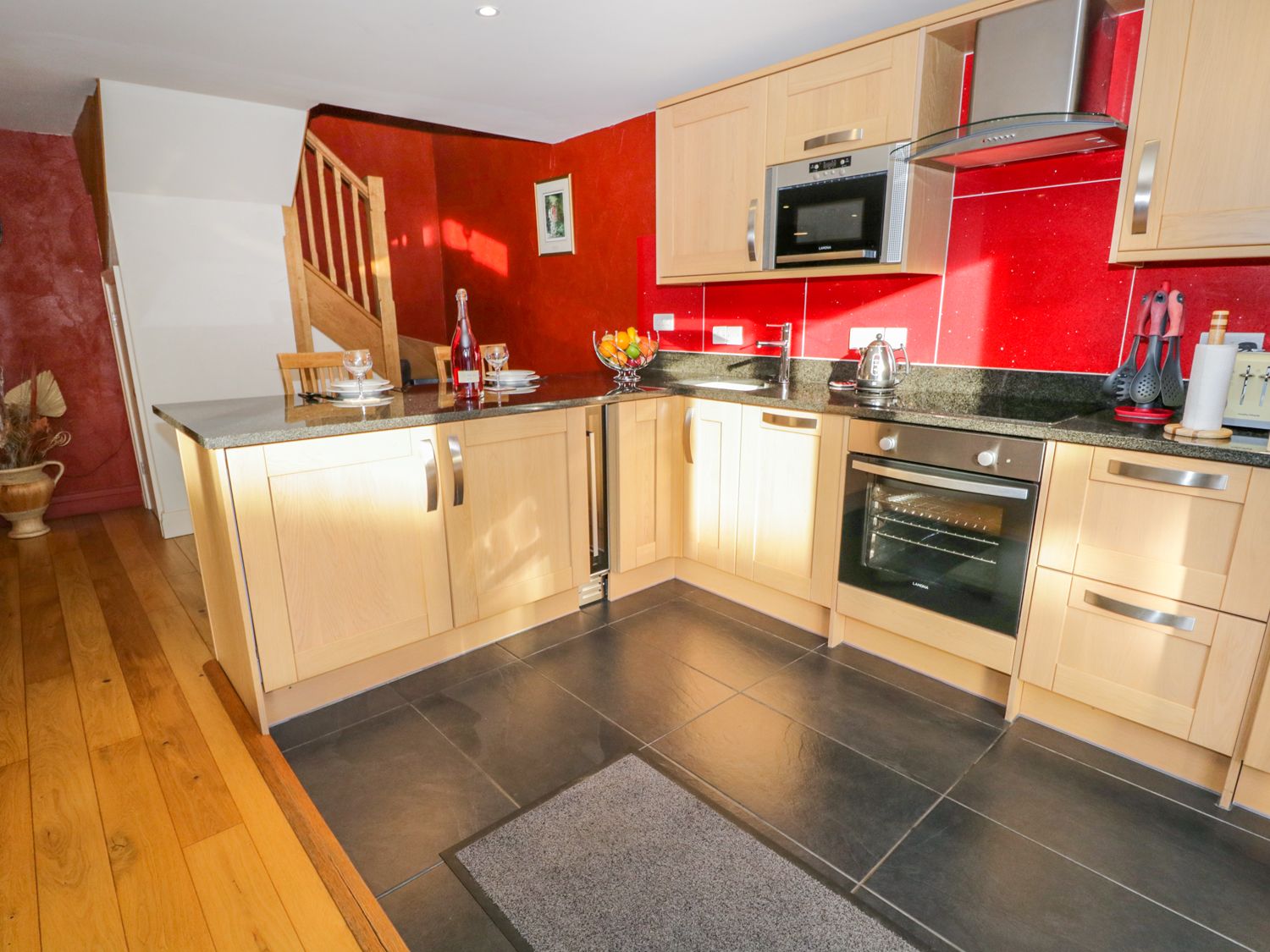Kitchen, electric oven and hob, microwave, fridge freezer, wine cooler, dishwasher and food disposal unit.